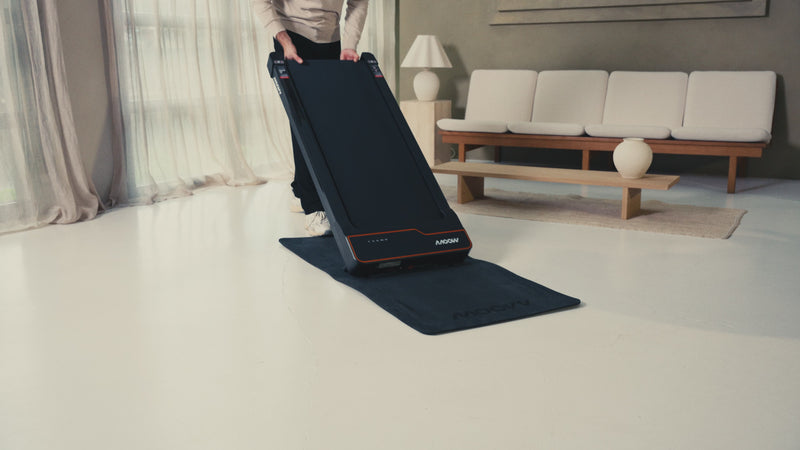 Sperrige Fitnessgeräte waren gestern: Das Moovv-Laufband lässt sich dank integrierter Transportrollen ganz einfach unter dem Sofa oder Bett verstauen.