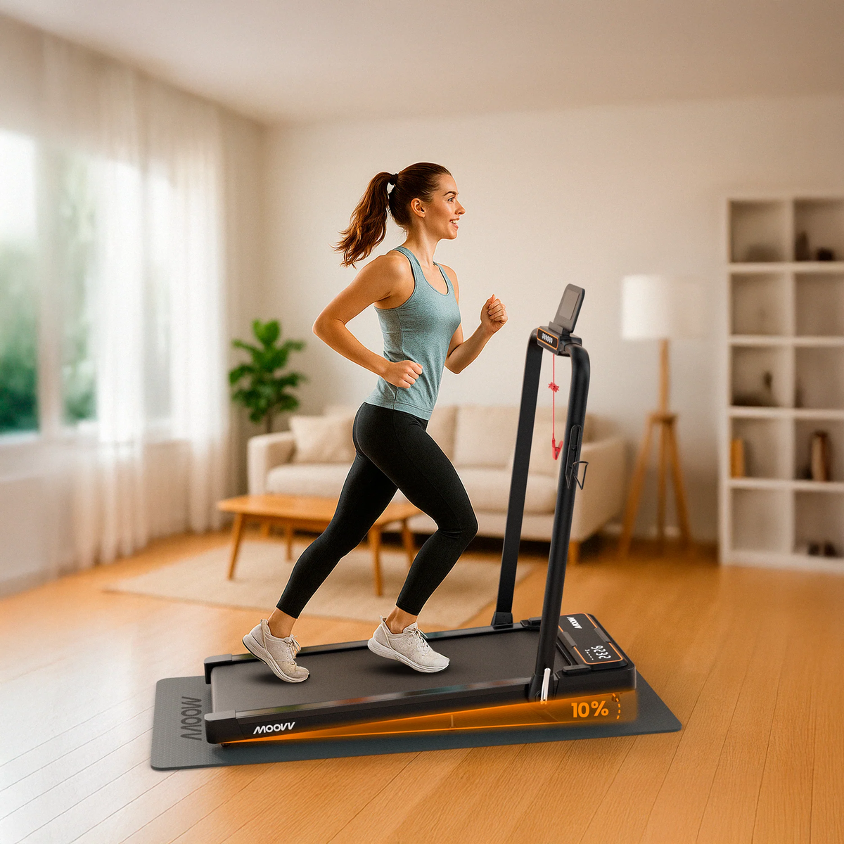 Sperrige Fitnessgeräte waren gestern: Das Moovv-Laufband lässt sich dank integrierter Transportrollen ganz einfach unter dem Sofa oder Bett verstauen.